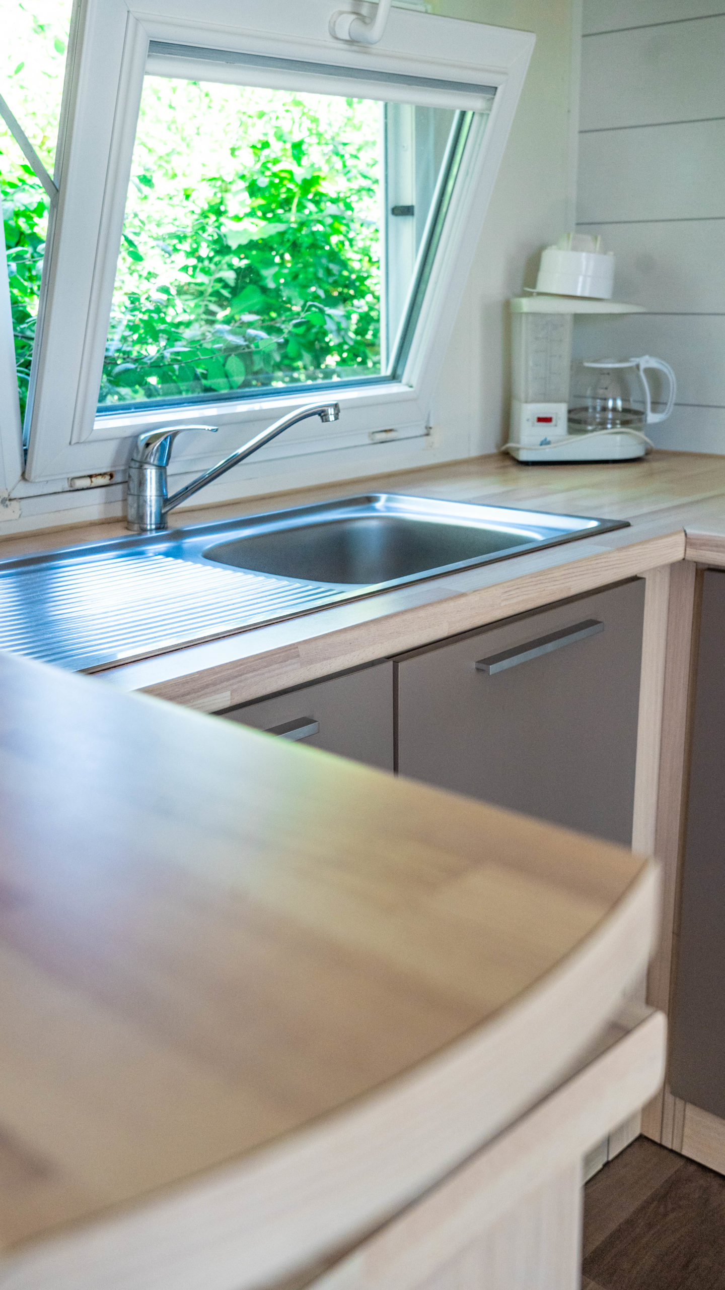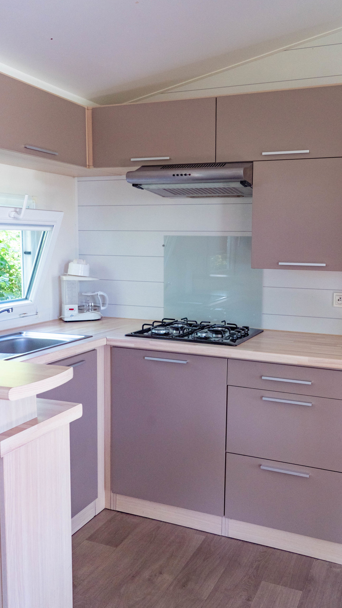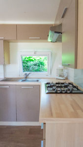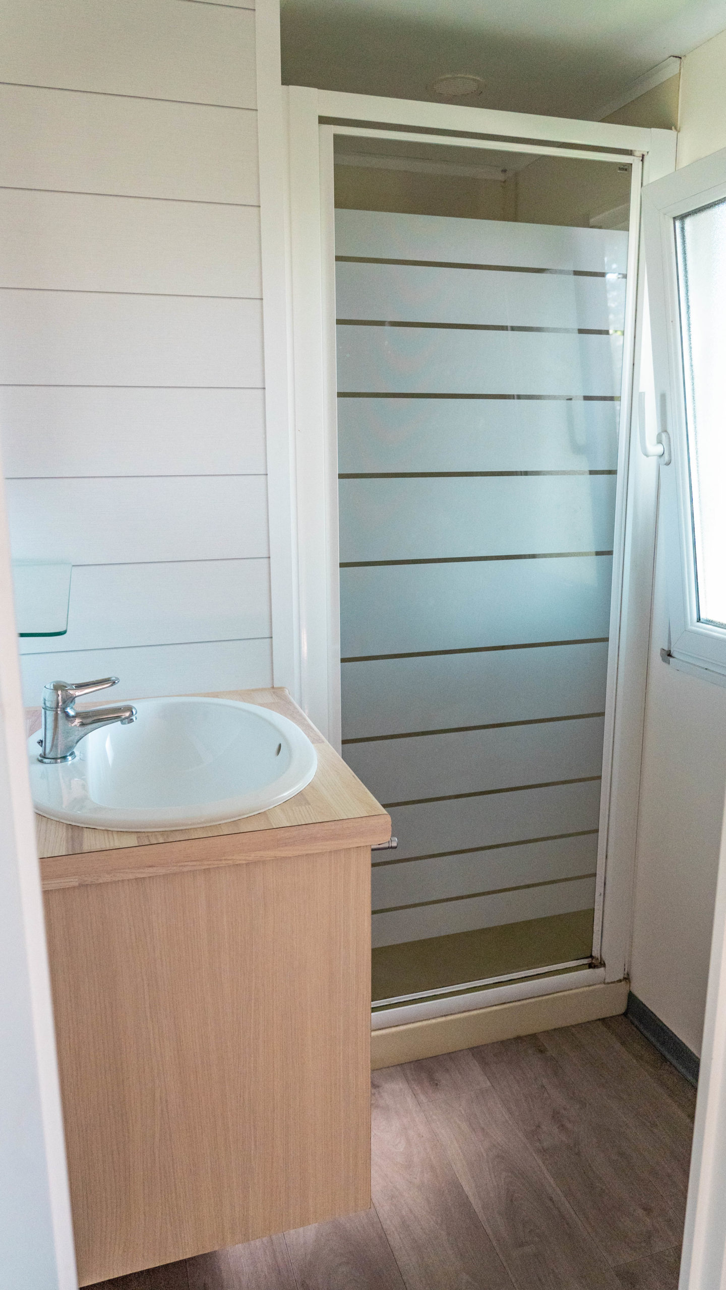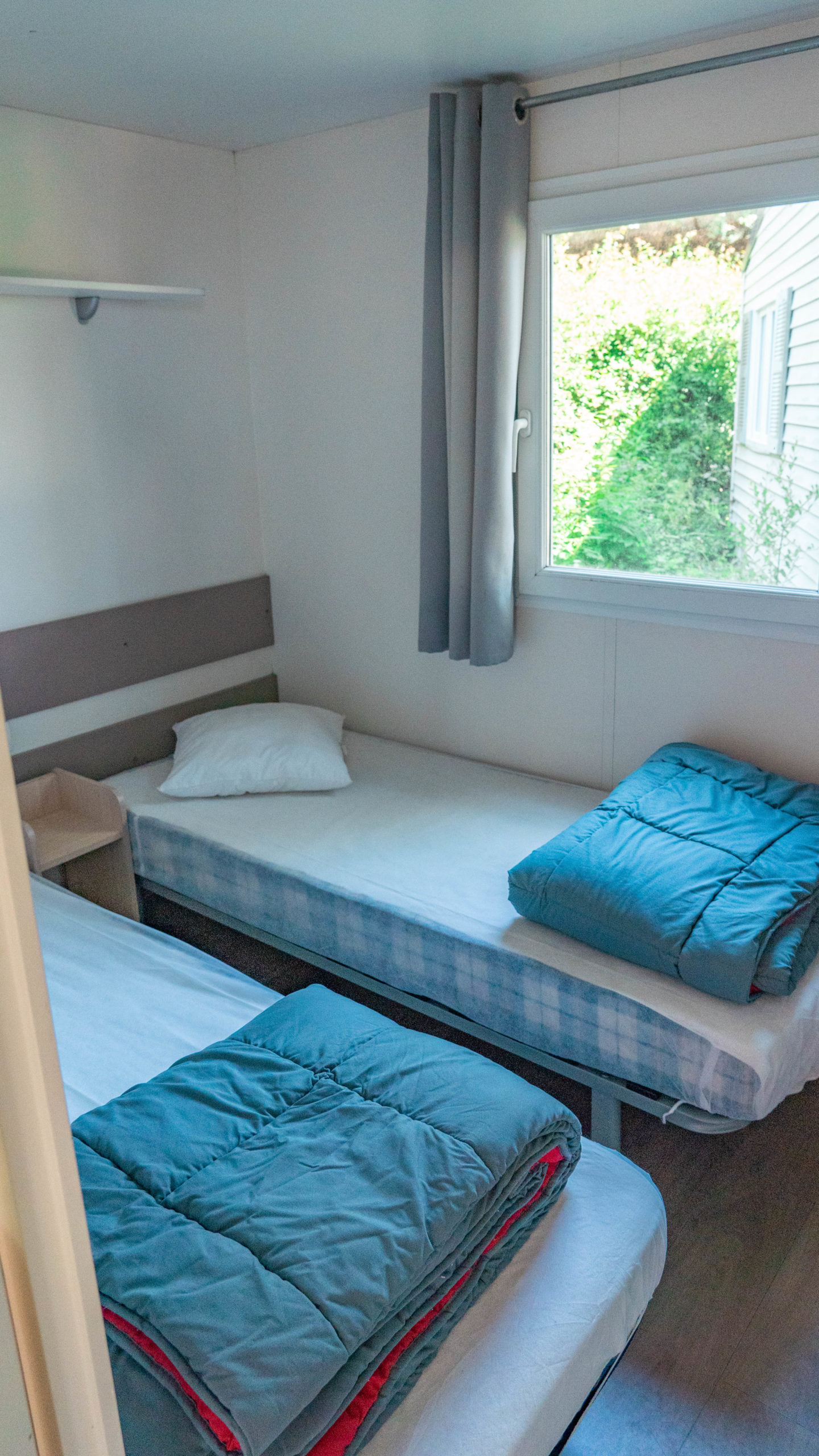 Chaque mobile-home est pensé pour votre bien-être et se compose d’une chambre avec un lit double (160 × 200), d’une chambre avec deux lits simples (90 × 190), d’un salon convivial avec banquette convertible, d’une cuisine fonctionnelle, d’un WC, ainsi que d’une salle de bain avec douche et lavabo. À l’extérieur, vous pourrez pleinement profiter d’une agréable terrasse équipée d’un salon de jardin, idéale pour les repas et moments de détente en plein air.